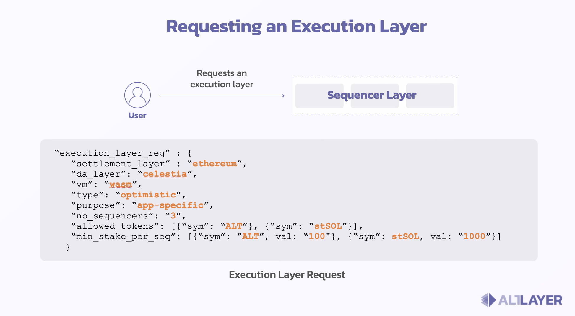 A user submits a request for a rollup via our dashboard or the SDK and specifies the requirements such as the type of VM, number of sequencers and the minimum stake and the allowed token list.