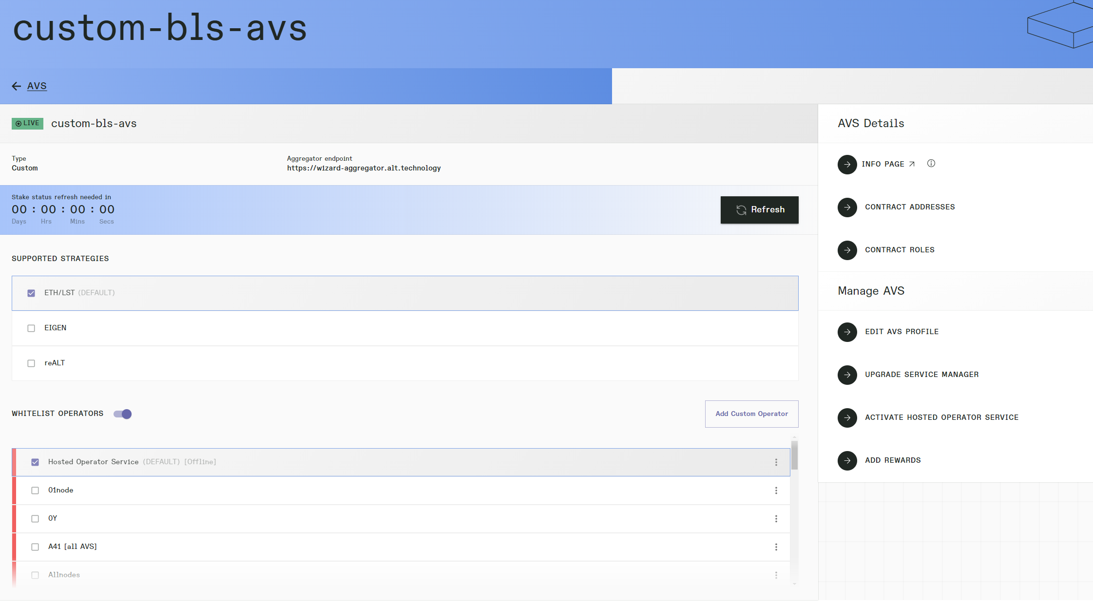 Finally, Wizard provides an intuitive UI to manage your AVS post-deployment, which includes managing roles, operator whitelisting and updating metadata.&#x20;