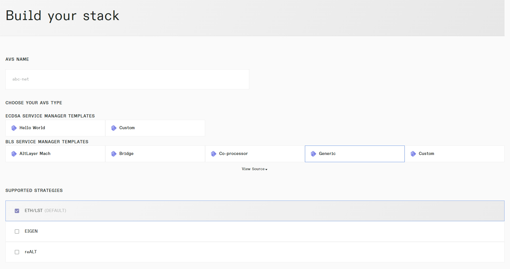 After customizing the AVS, users can proceed to AVS deployment, which will include both on-chain and/or off-chain components. This includes selecting which service manager (either a Template or Custom) and strategies to support.